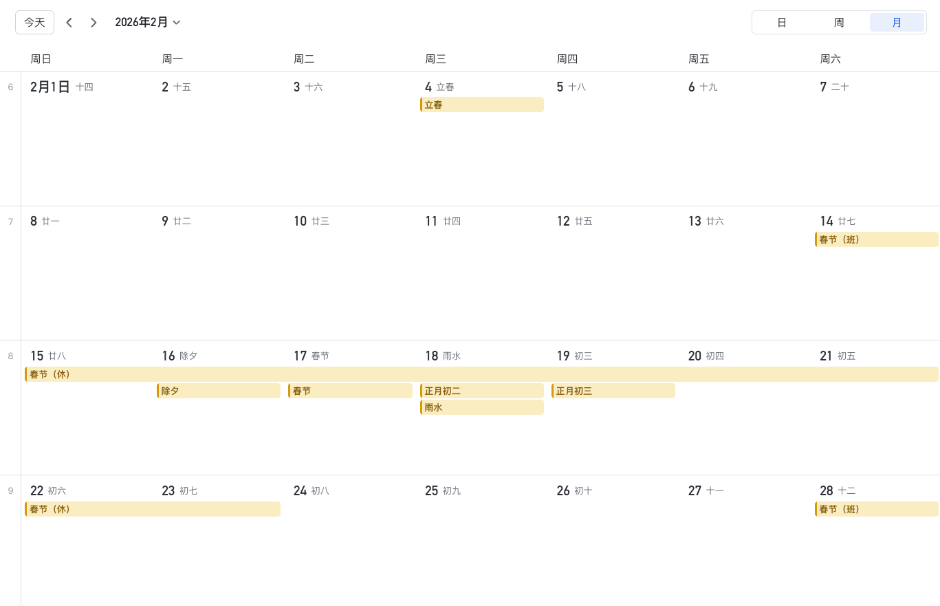 console.log(`ℹ️ 创建新日历: ${config.calendar.name}...`); const createRes = await axios.post(`${FEISHU_HOST}/calendar/v4/calendars`, { summary: config.calendar.name, description: "自动同步的节假日日历", permissions: "public", color: config.calendar.color, summary_alias: config.calendar.name }, { headers }); return createRes.data.data.calendar.calendar_id; }
